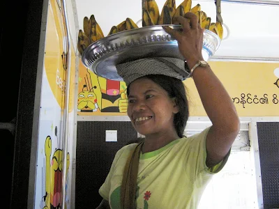 | 在車上,小販用頭頂著貨品向乘客兜售的,十分有趣。 |