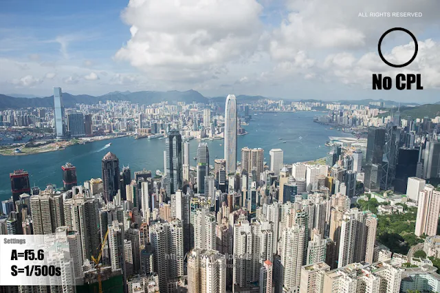 在山頂盧吉道同一角度,分別拍了三張相片,分別是沒有CPL,裝上了 CPL 但調較不當,及裝上了CPL並作適當調較。可以留意雲的層次,天空的藍調,有著明顯的差別。